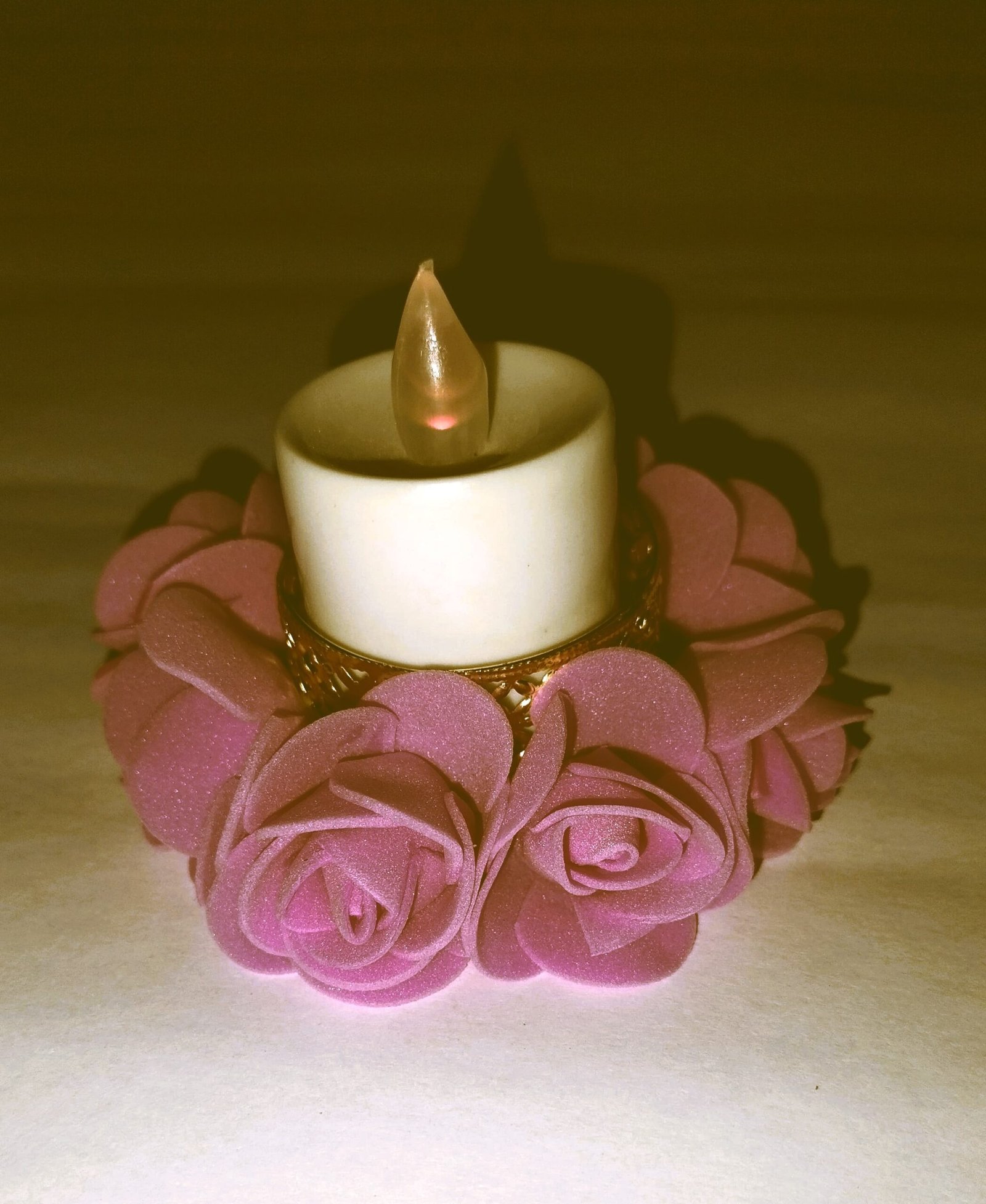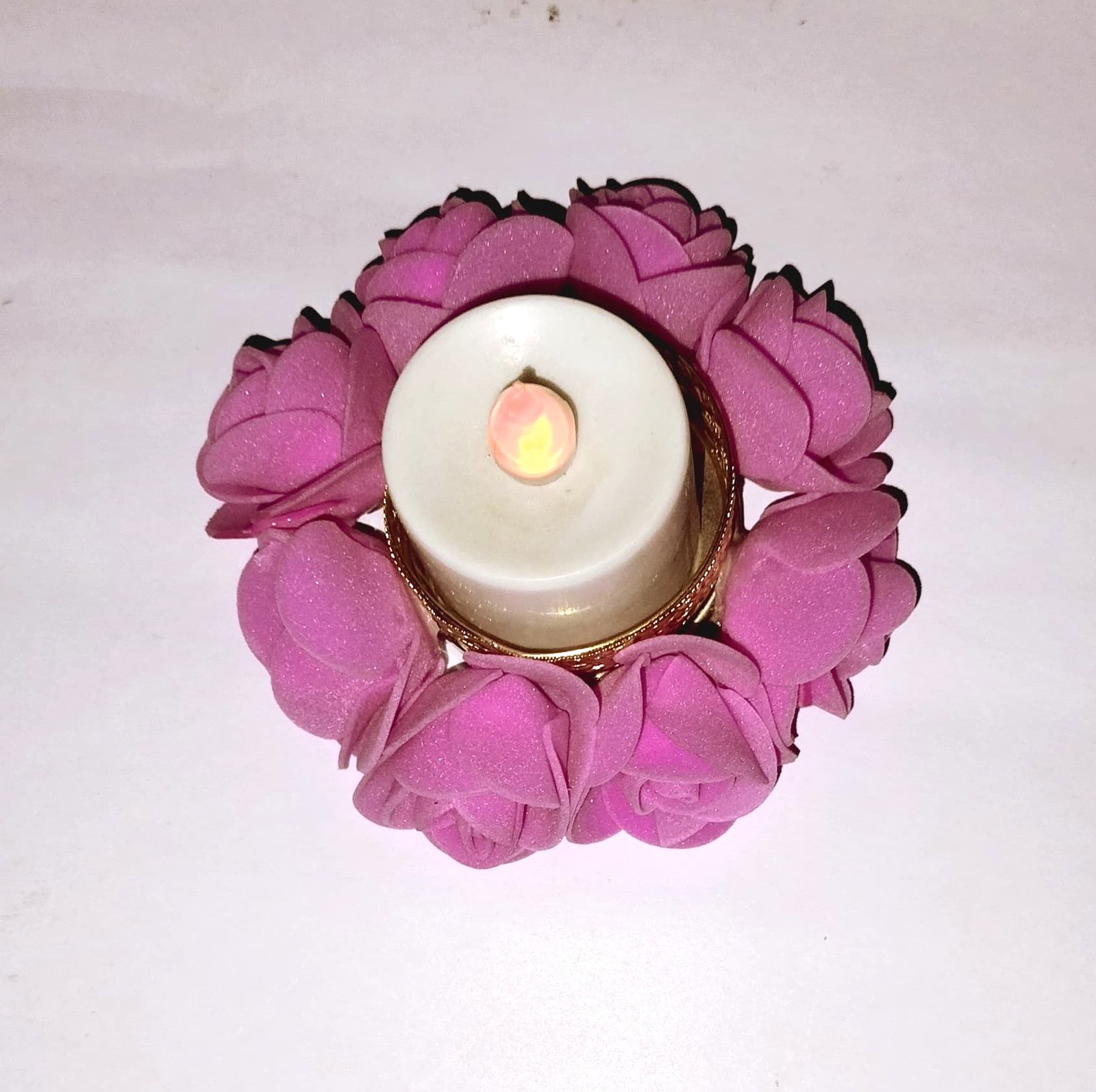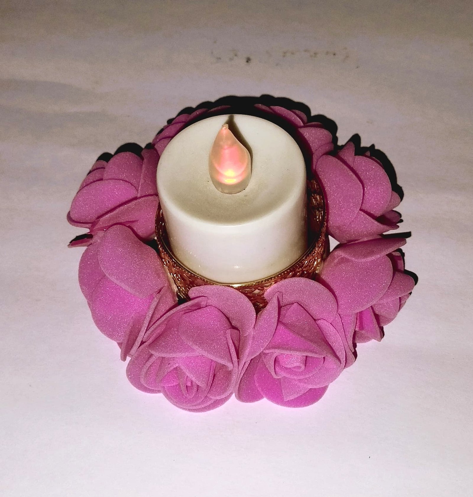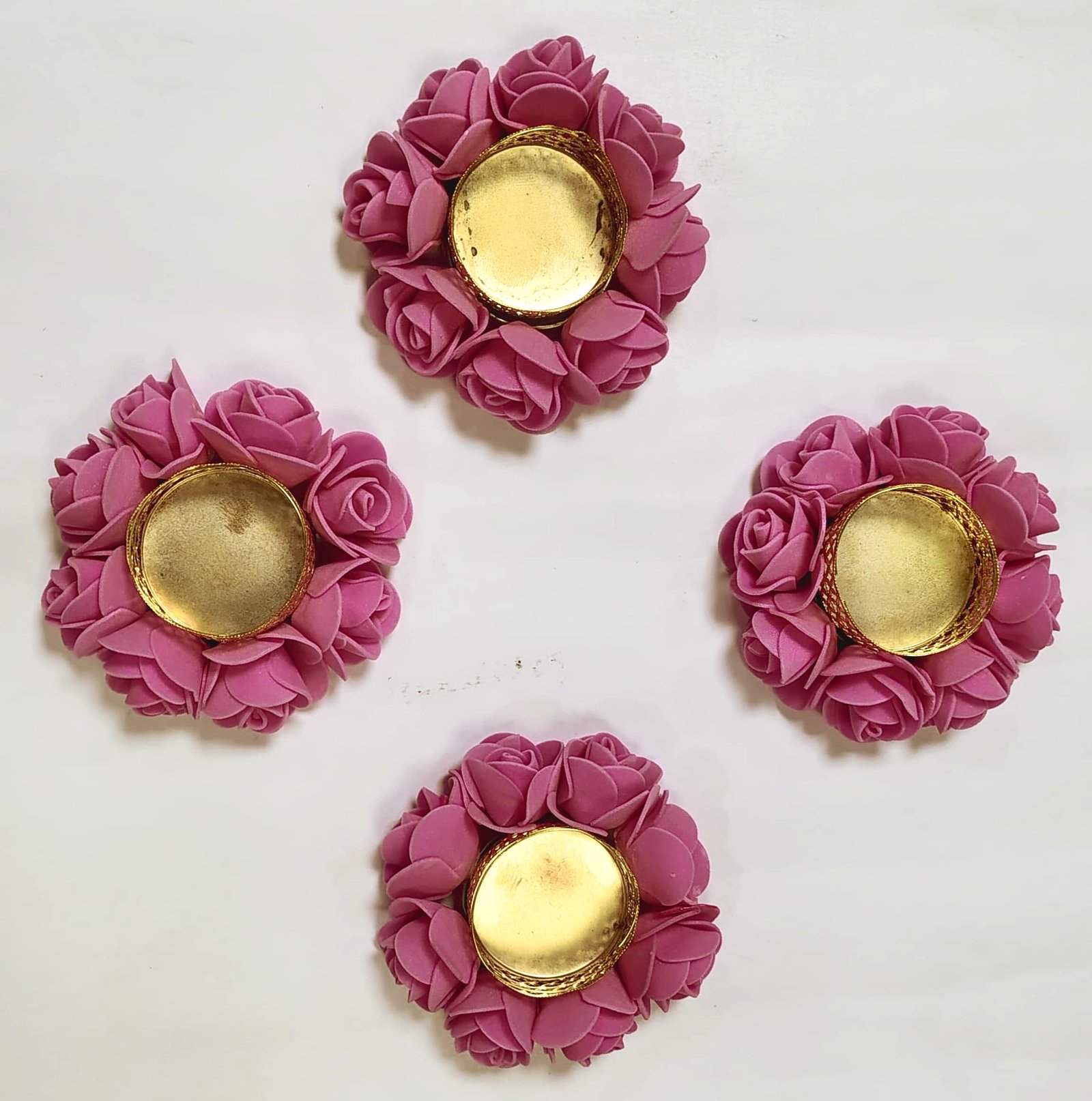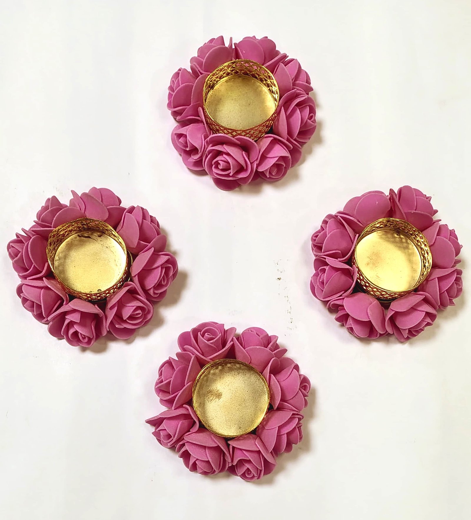 Brighten up your festive celebrations with this elegant set of 4 tealight holders adorned with handcrafted artificial pink roses. Each holder features a golden metallic base at the center, designed to hold standard tealight candles securely, surrounded by a cluster of delicate pink foam roses. The vibrant floral arrangement adds a touch of charm and luxury to your décor.