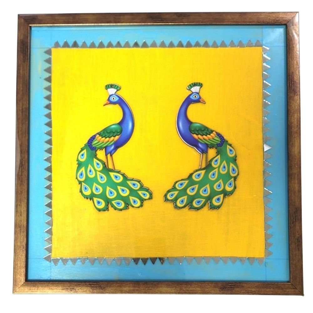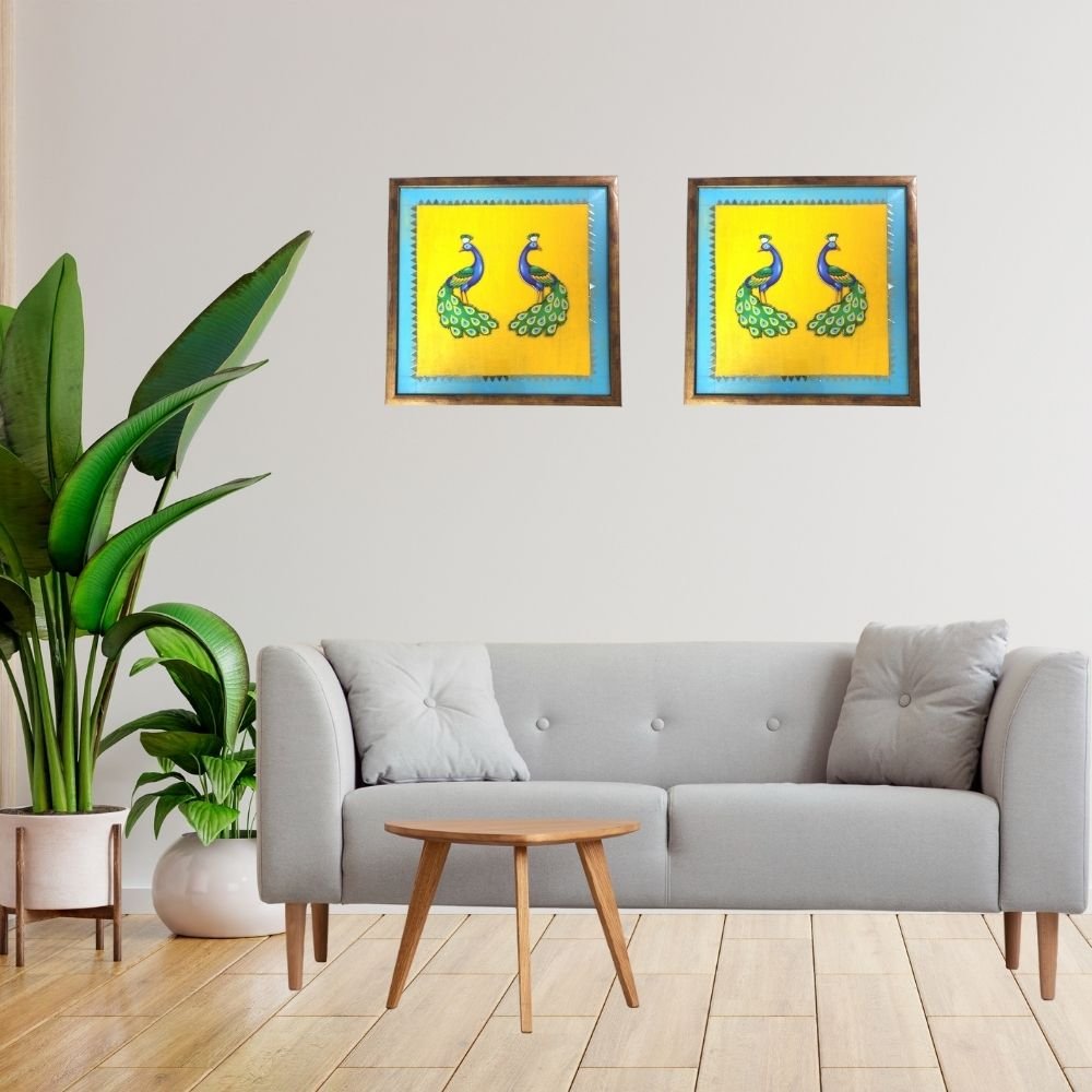 Bring harmony and elegance into your space with this beautifully handcrafted Peacock Wall Art. Featuring a pair of vibrant blue and green peacocks against a radiant yellow background, this piece is not just a decoration but also a symbol of positivity and transformation.