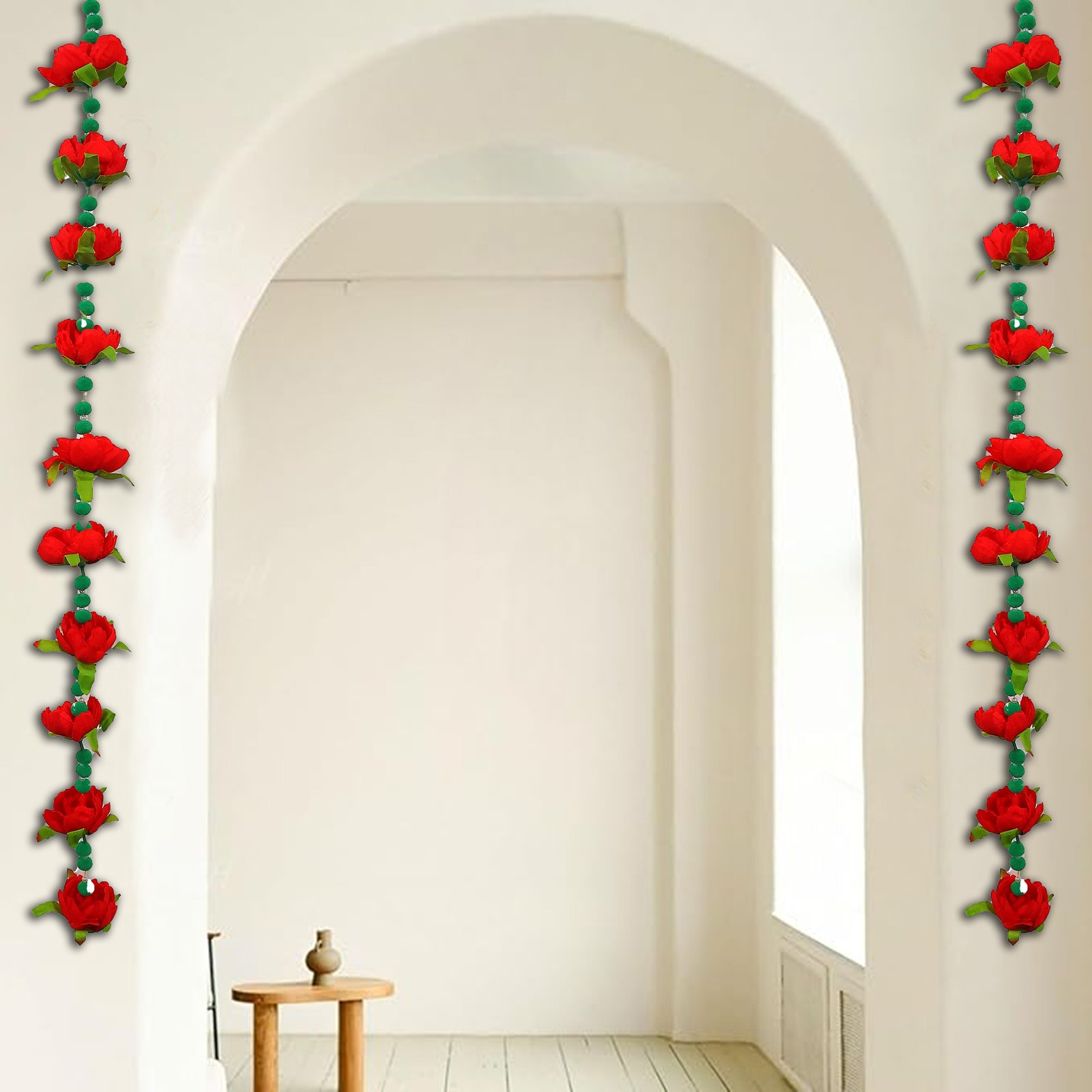 Bring festive cheer to your space with the Red and Green Handmade Ladi, a stunning combination of vibrant red foam flowers and green pom-poms. This handcrafted hanging décor is perfect for enhancing the beauty of your doorways, pooja space, balconies, or walls during festivals and special occasions.